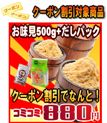 ●今一番のお勧めはコレ! 割引クーポン利用で880円初体験!プラチナ会員様優待セール話題沸騰のご当地味噌(甘口)‘瀬戸内麦の味噌500g’と和風天然だしパックのセットこの味ハジメテ!絶対に失敗しないおいしいお味噌汁パック価格: 1,018円 下記は、クーポン割引適用後の割引表となります。割引クーポンは、メールマガジンなどで不定期にて発行しております。【悩み解決】まだ、冷蔵庫にスーパーで買った味噌が残っているから今は買わないお客様【悩み解決】味噌なんてどれも一緒。なんでわざわざお取り寄せするの?というお客様【会社概要/初めてのお客様へ】【決済方法・送料】安心後払い、各種決済方法をご用意【到着ナビ】即納します!平日13時までのご注文は即日発送 商品名 ご当地味噌でおいしいお味噌汁パック [宅急便発送にてお届け] 梱包商品 ■麦みそ500g×1 ■和風天然だしパック8g×2 (だしパックは、1パック(8g)で 約500ml?600ml (更新日時:2010/12/16 11:45) Supported by 楽天ウェブサービス |